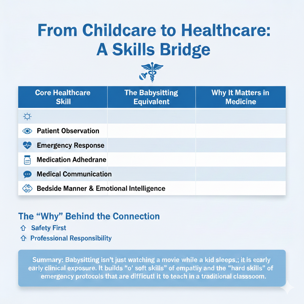 When viewed through a healthcare lens, babysitting is far more than a part-time job — it is early clinical exposure. Babysitting/childcare teaches responsibility, safety awareness, communication, and hands-on caregiving in real-world environments. For students considering careers in nursing, medicine, EMS, or allied health, babysitting can serve as an accessible and meaningful first step into the healthcare field.